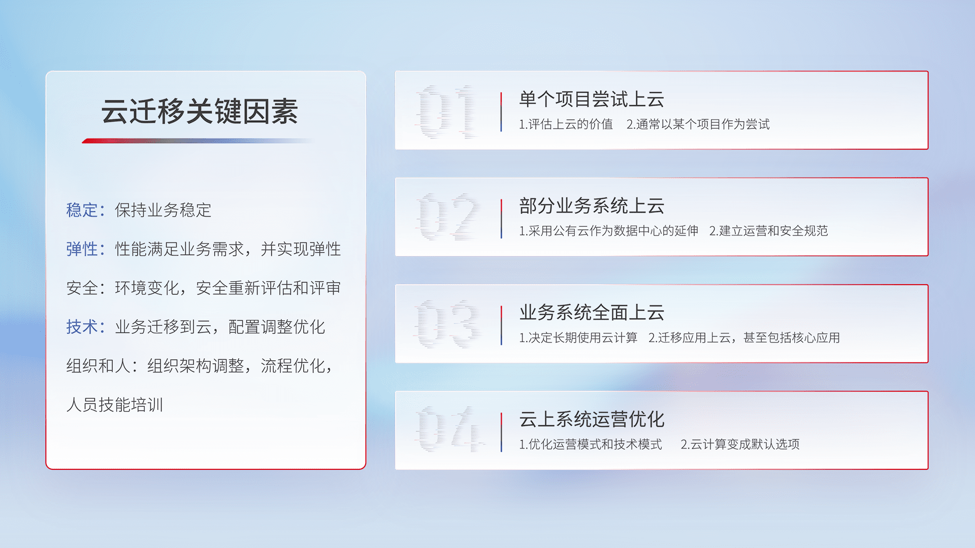 结合实际业务,,,从规划设计、、、云平台选型、、、云原生改造、、、、数据迁移、、集成交付,,,迁移全过程为客户识别最佳上云路径,,做好风险识别管理,,设计网络架构、、身份权限、、、安全审计合规、、操作审计、、、、日志审计、、、监控告警策略、、、多站点容灾设计等,,,对云上基础设施进行整体规划,,,,提升IT治理水平,,,以满足弹性、、、高可用、、、高性能的需求。。。