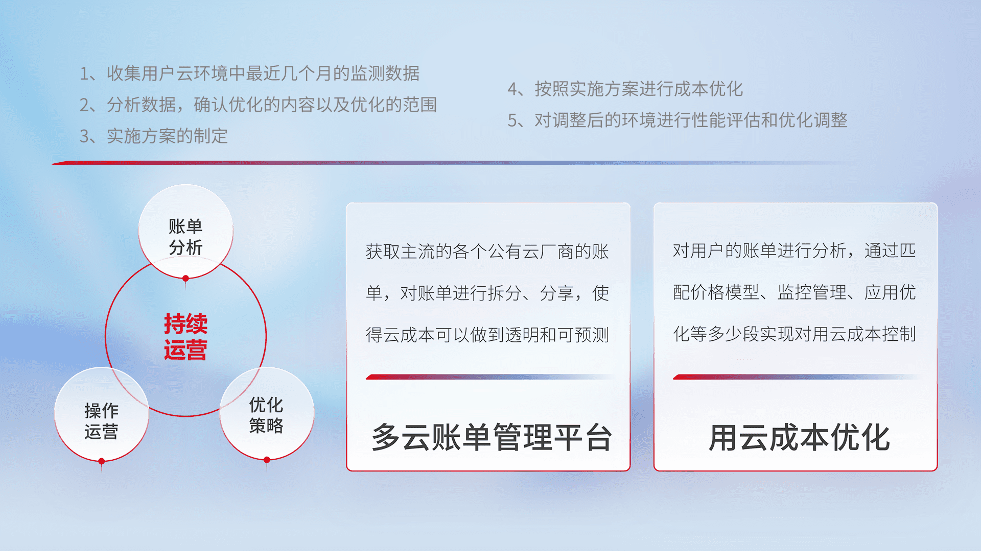 通过灵活运用多种自动化迁移工具,,,,帮助企业用户实现业务和数据高效 、、、、稳定的上云迁移和云上迁移,,采用自研多云纳管平台,,以中立管理模式,,,,解决多组织、、、多云、、、、多运维厂商的复杂关系的管理,,保证多云平台资源配置的一致性,,,实时掌控云资源运行数据,,,,运用智能化工具分析云资源多云平台的管理服务,,透明化管理成本支出,,,,用云成本可预测、、、用云费用可优化、、、云资源配额有据可依。。。