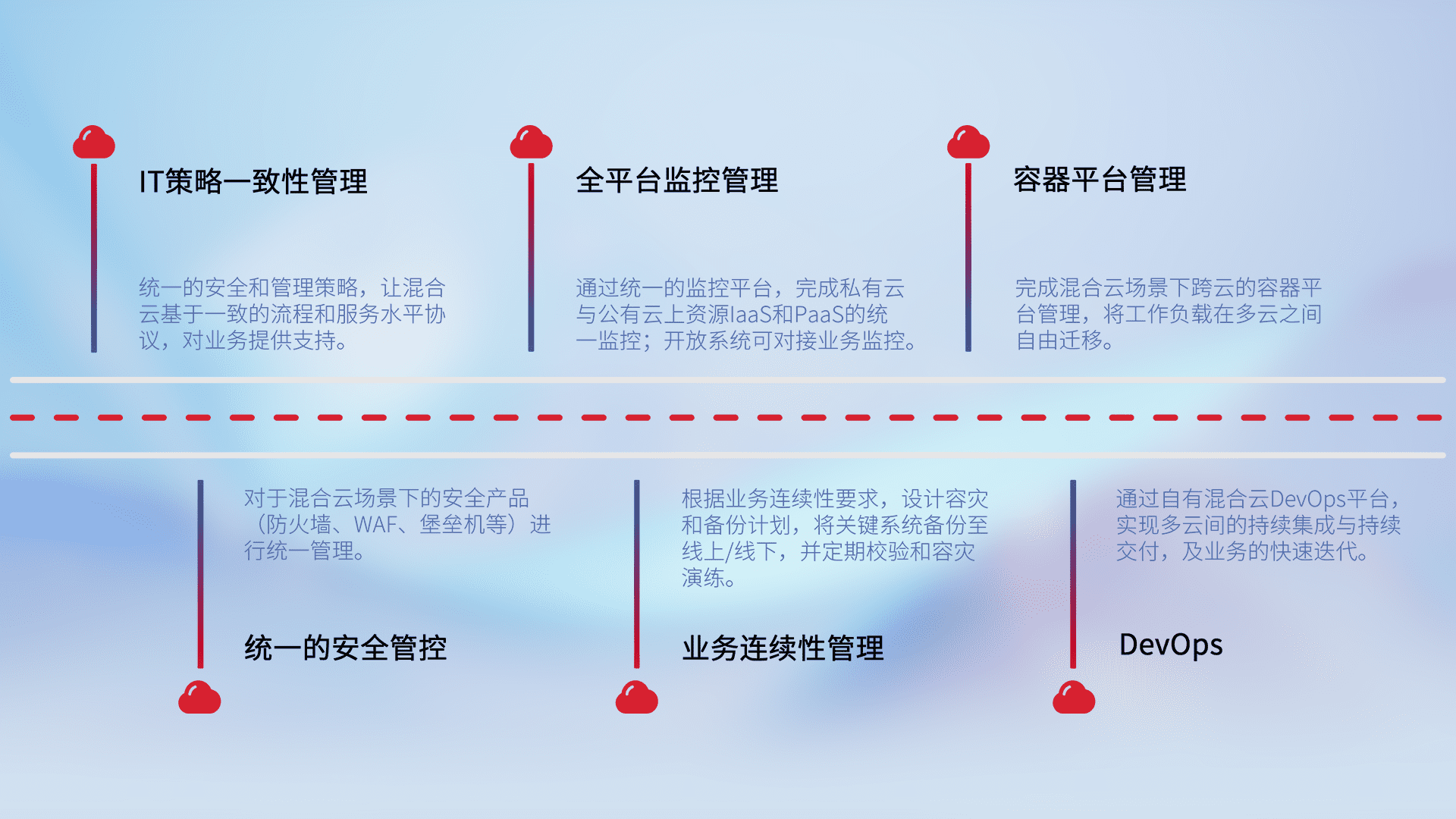通过多云纳管,,以统一的资源数据模型把客户的云资源进行抽象和封装,,,,进而实现对多云资源的统一操作,,保障云资源管理的可靠性、、稳定性与可用性。。。。量身定制化运维内容,,,配置、、、开发运维、、补丁管理、、、备份、、、监控、、认证和访问管理、、、审计和日常巡检等,,,,保障在用云过程中的可靠度,,,,稳定度以及高可用率。。。