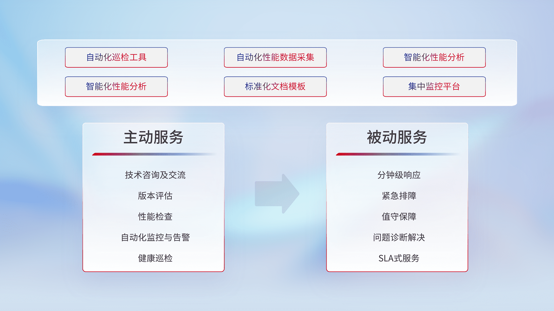 智能化工具和标准化文档,,保障服务质量,,,提供主动服务(包含技术咨询、、、、版本评估、、、性能检查、、自动化监控与告警、、健康巡检)和被动服务包含(分钟级响应、、紧急排障、、值守保障、、、、问题诊断解决、、、、SLA服务)。。。。